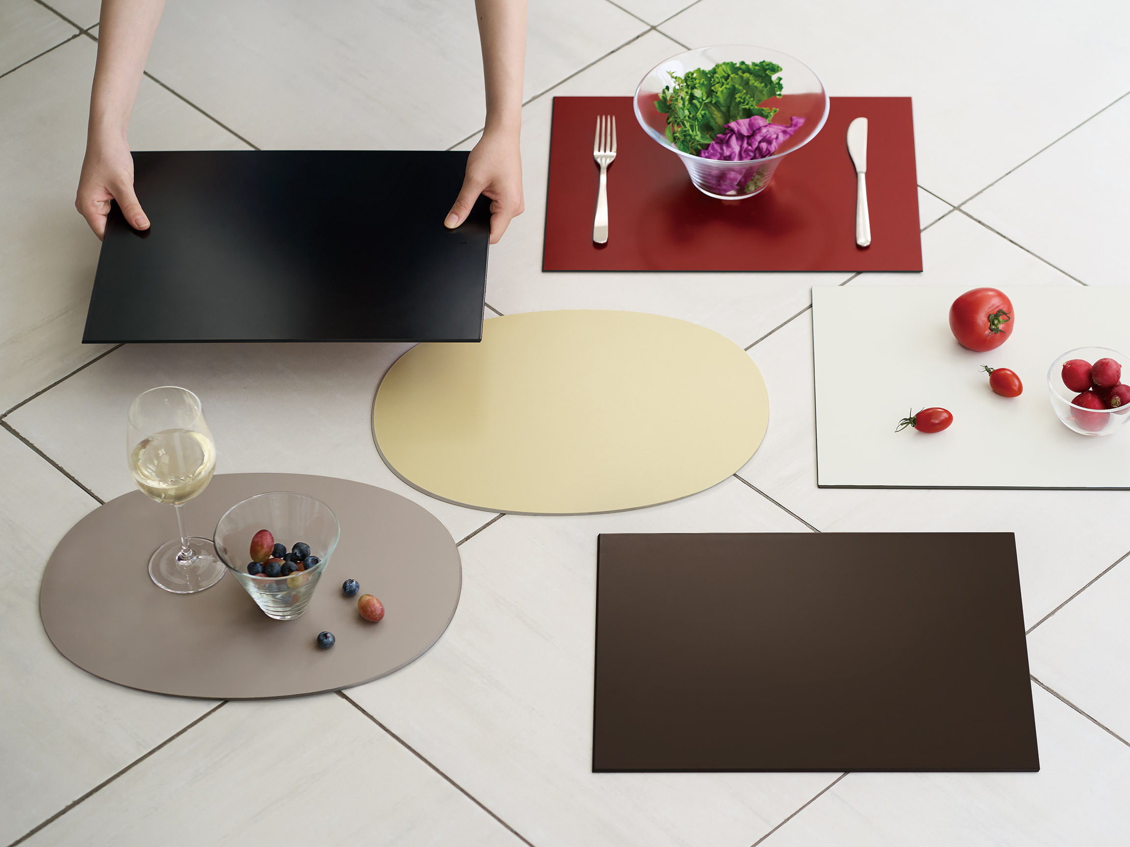 持ちやすさと取り上げやすさも追求し端の部分は若干斜めにカットされています。ノンスリップで配膳もスムーズ、食材をのせれば洗い物が少なくシーンにあわせてお使いいただけます。