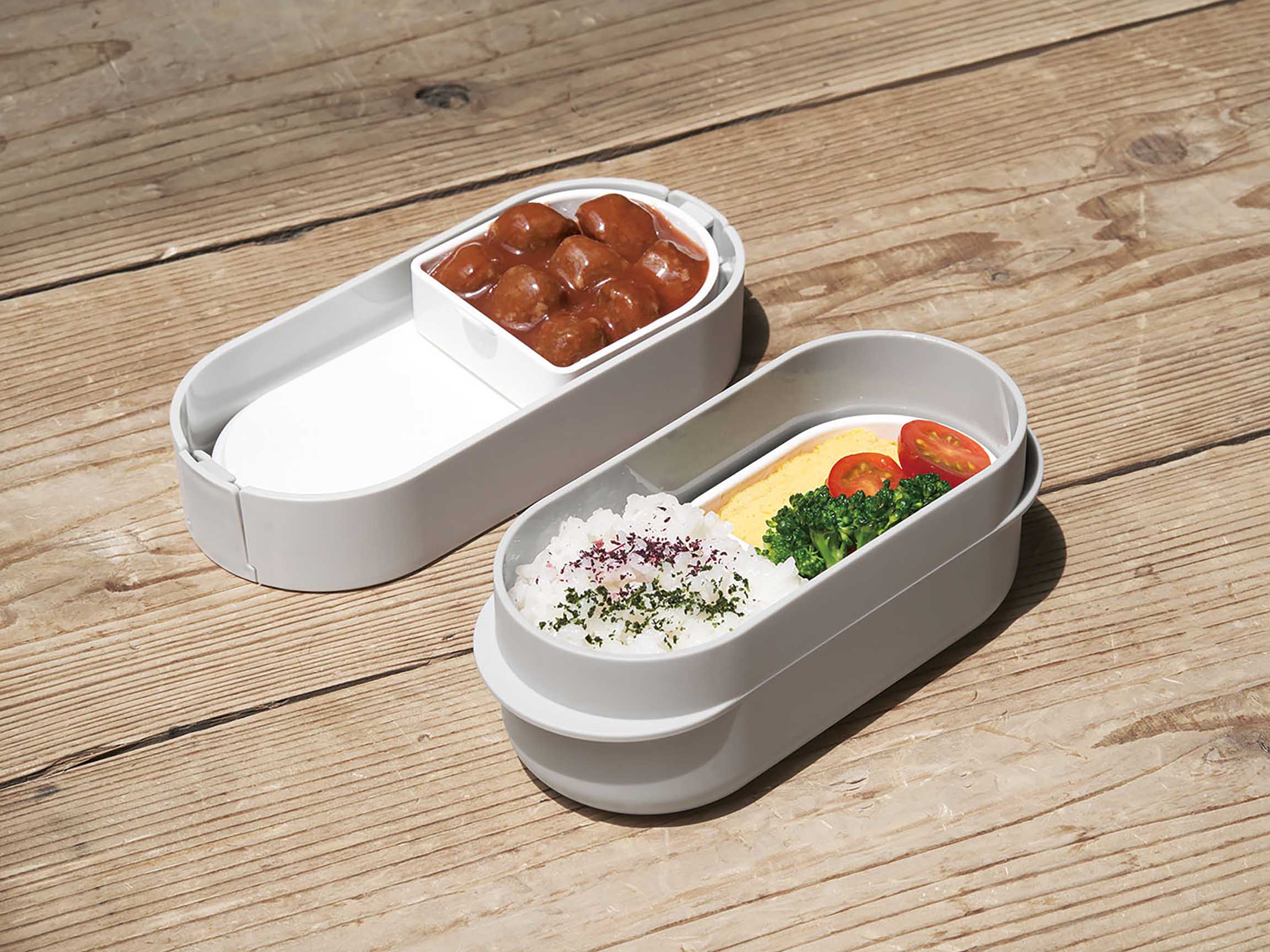 汁漏れ防止の2点ロックランチボックス。ロック部分のパーツも分解可能、おかずをわける便利な中仕切りカップが2個、もちろん全てのパーツが食洗機対応です。