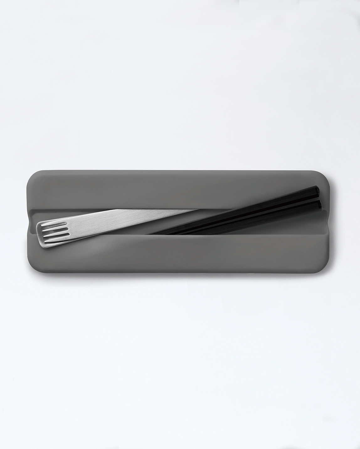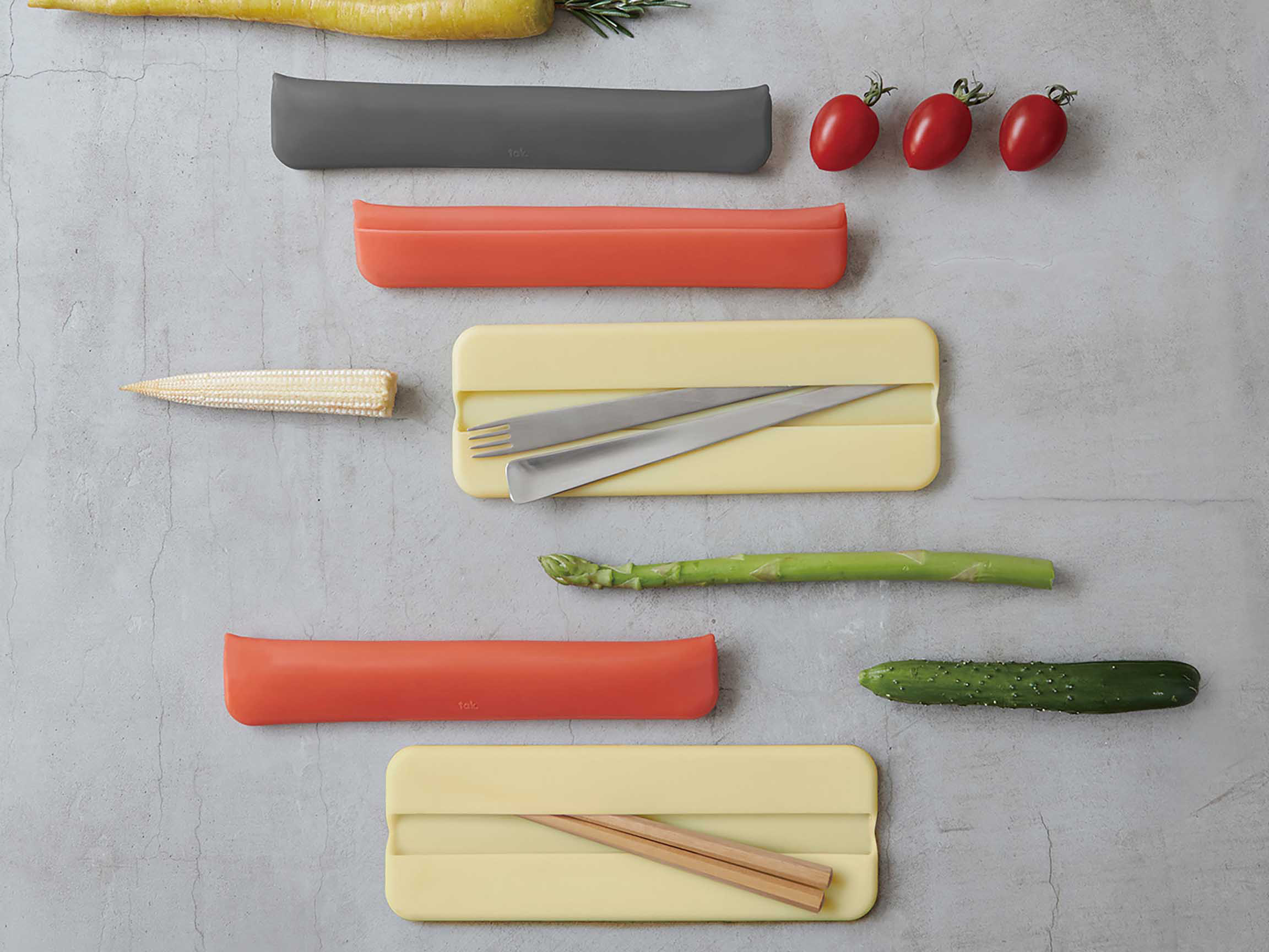 スプーン、フォーク、箸をスリムに持ち運べるカトラリーセットです。シリコーン製のケースに入れれば持ち運ぶとき音を吸収、中身に合わせて変形します。
