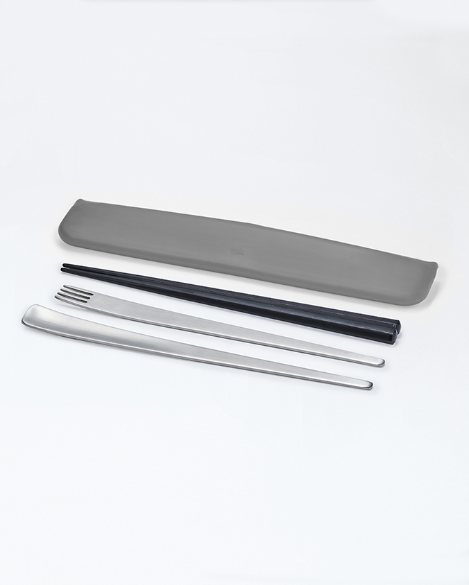 スプーン、フォーク、箸をスリムに持ち運べるカトラリーセットです。シリコーン製のケースに入れれば持ち運ぶとき音を吸収、中身に合わせて変形します。
