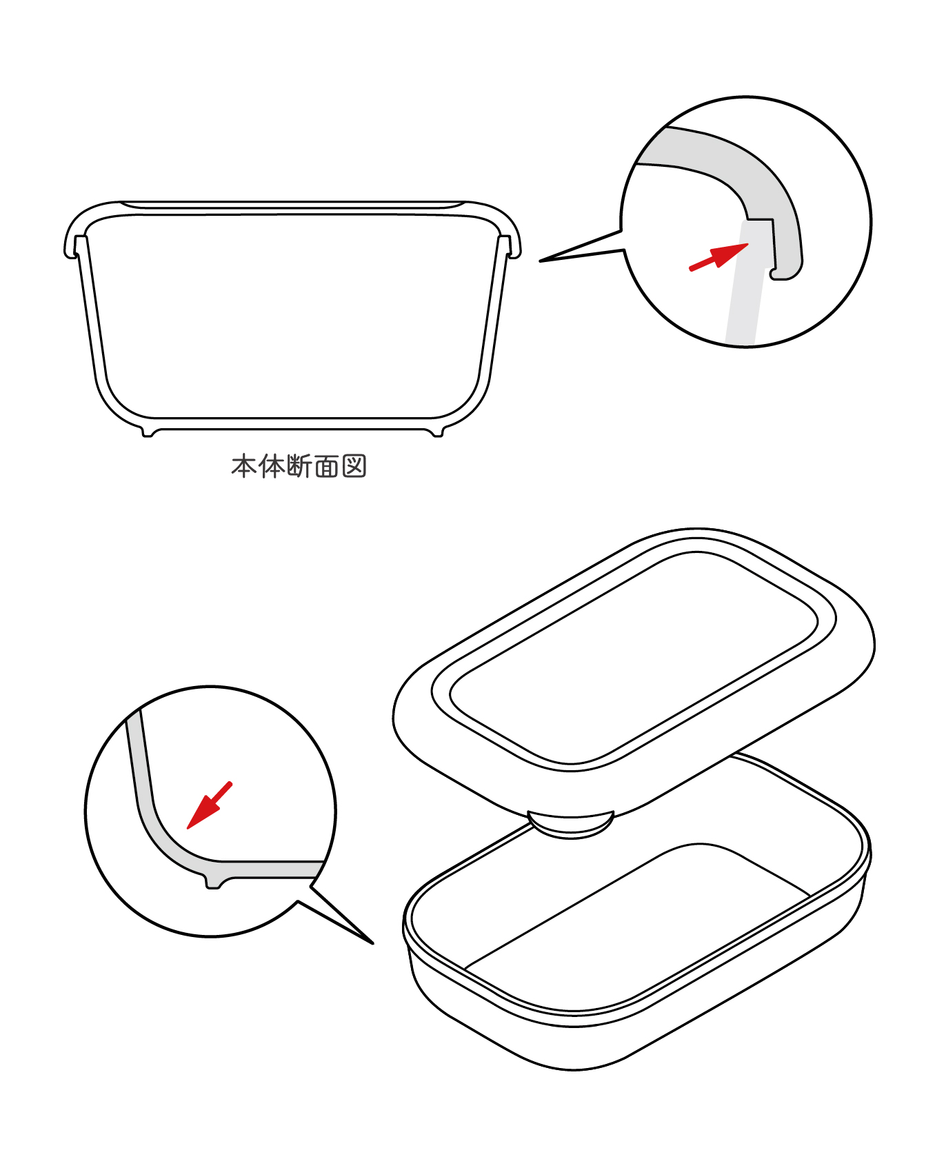 本体には角がなく洗いやすいことに加え、たったの2パーツで洗い物もラク!また、通常保存容器の蓋にあるパッキンや、フチ一周の溝も完全に無くし、角や隙間に汚れが溜まる心配もありません。