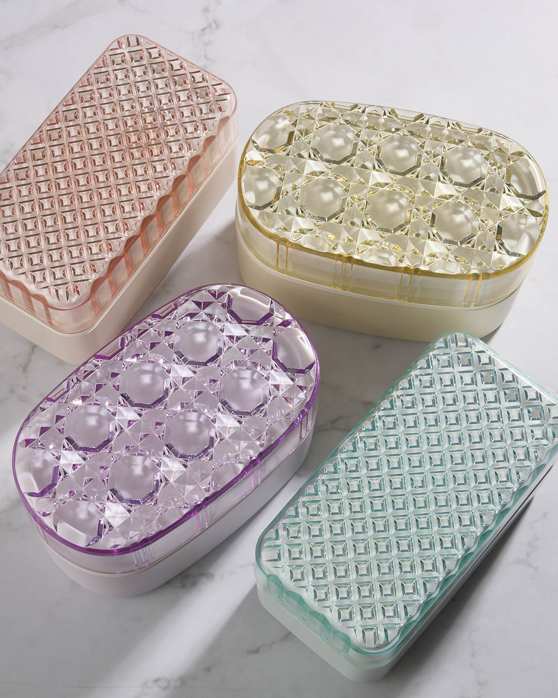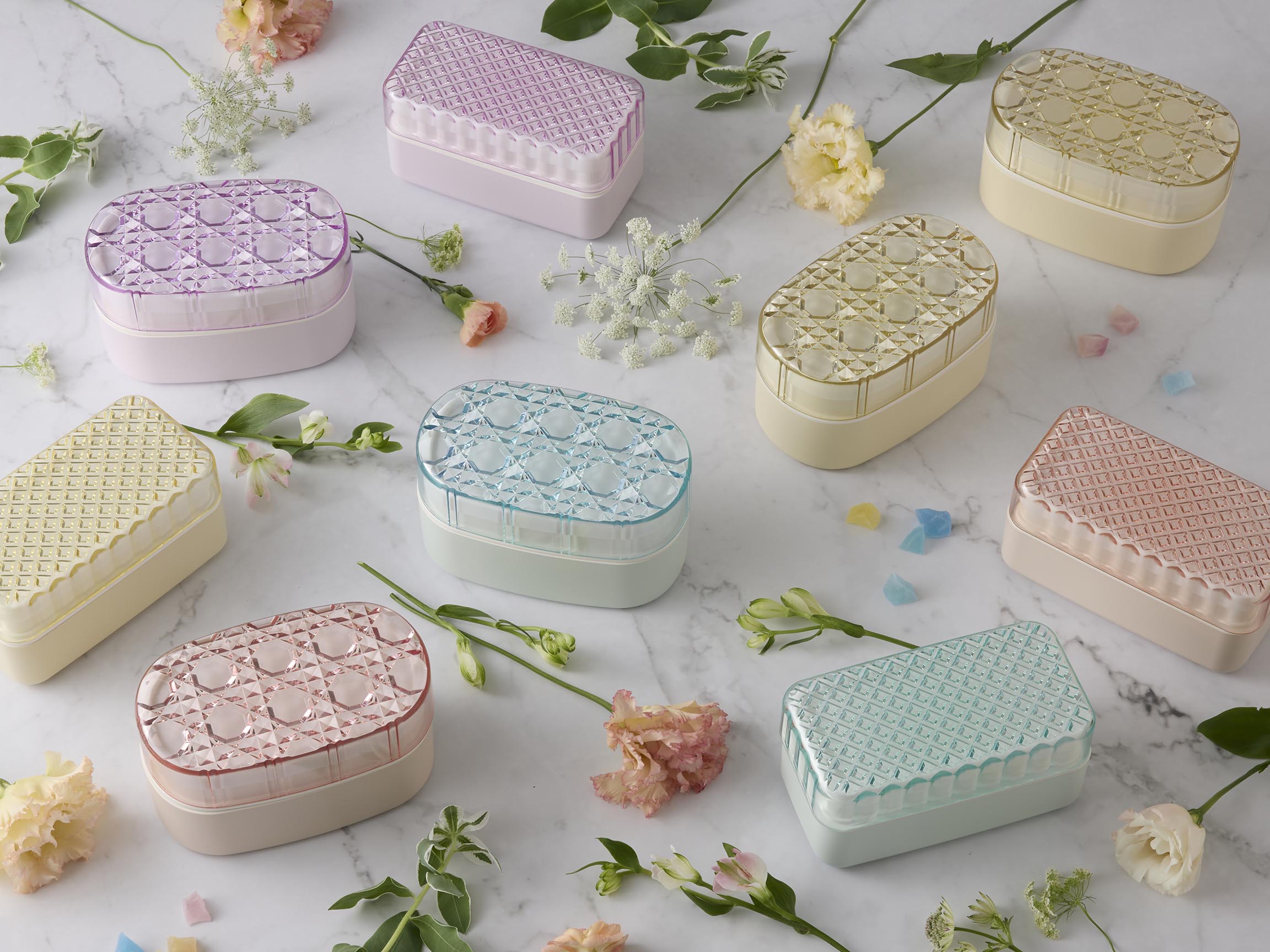 キラキラとしたジュエリーをイメージしたランチボックス。蓋は天然石をモチーフにした4色。