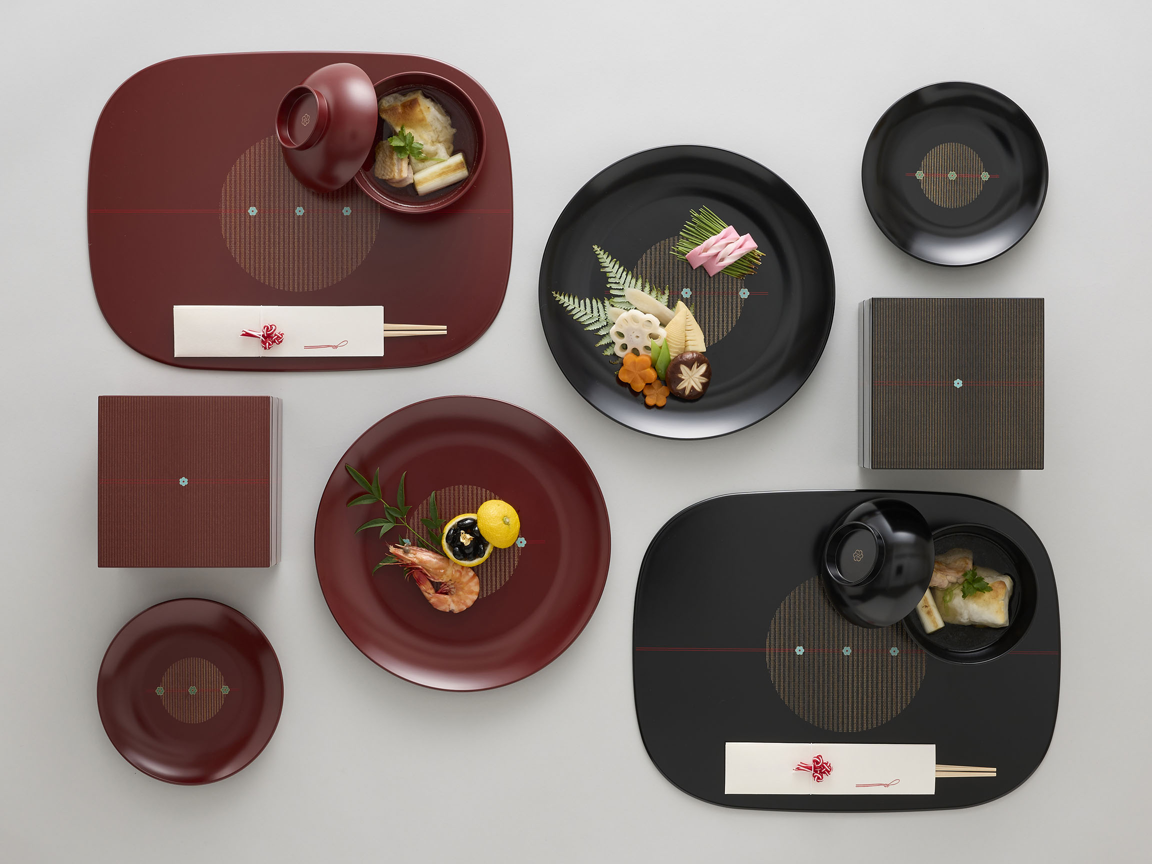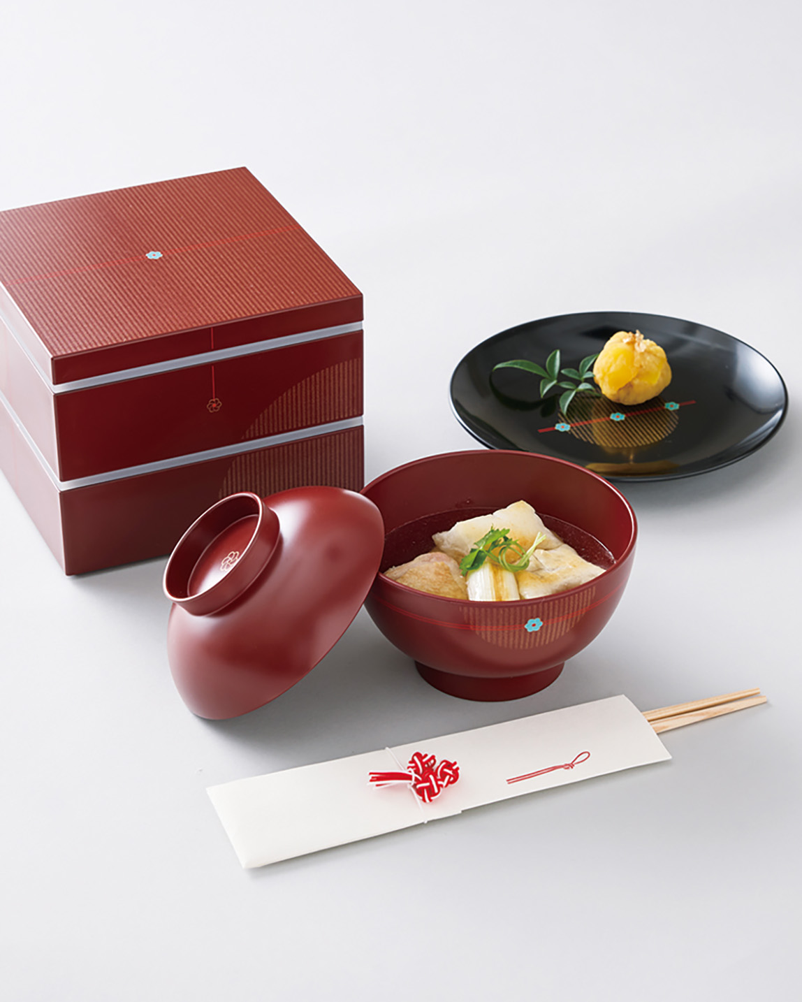 普段使いからお正月まで、ハレもケも美しく彩る朱と黒の食器。水引き装飾が華やかさを添え、食卓を特別な時間に演出します。