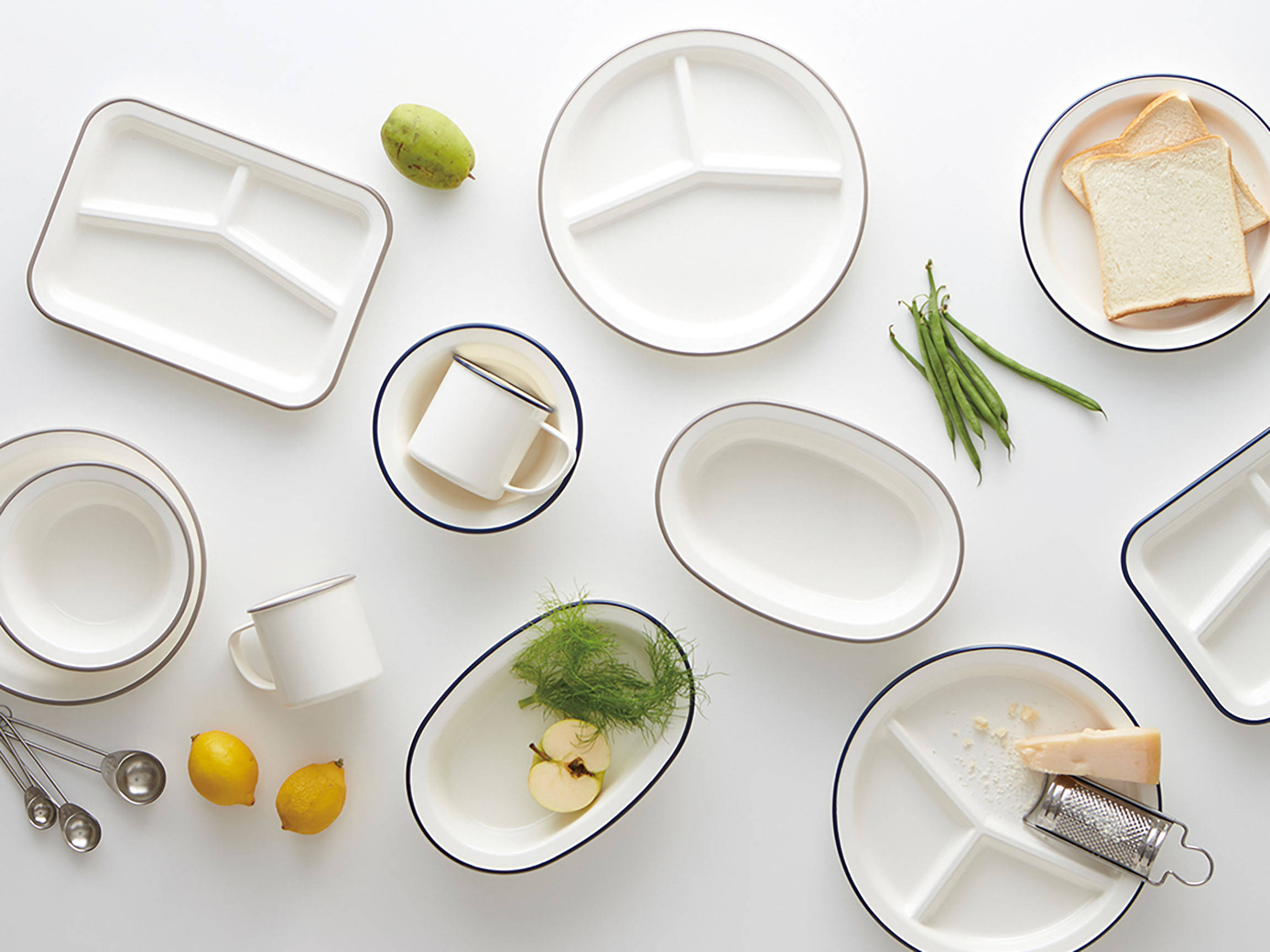 持ち手の大きなマグや丸型のボウルから角型の仕切り付きプレートまで。抗菌塗装だけでなく食器そのものの美しさを目指しました。