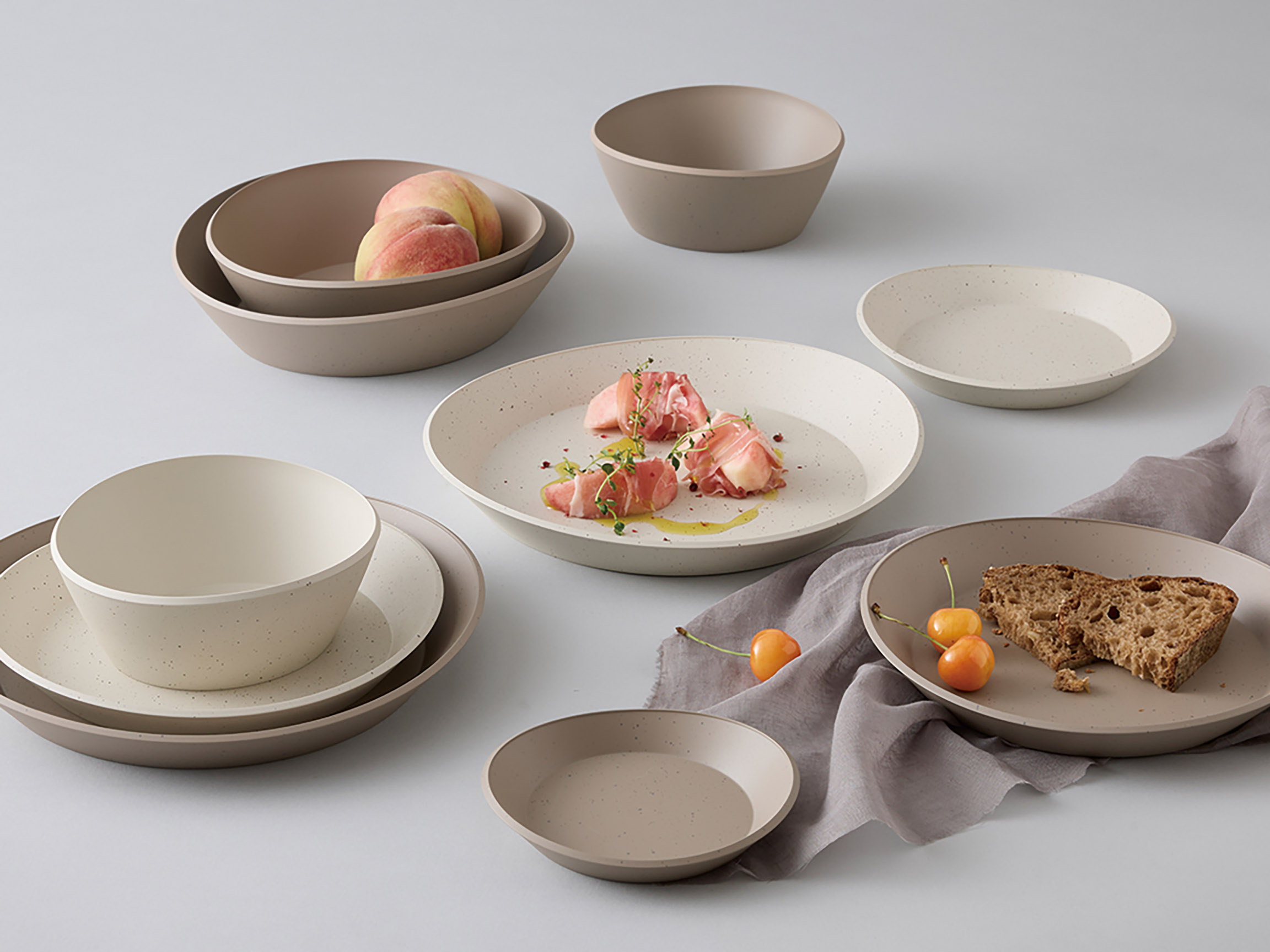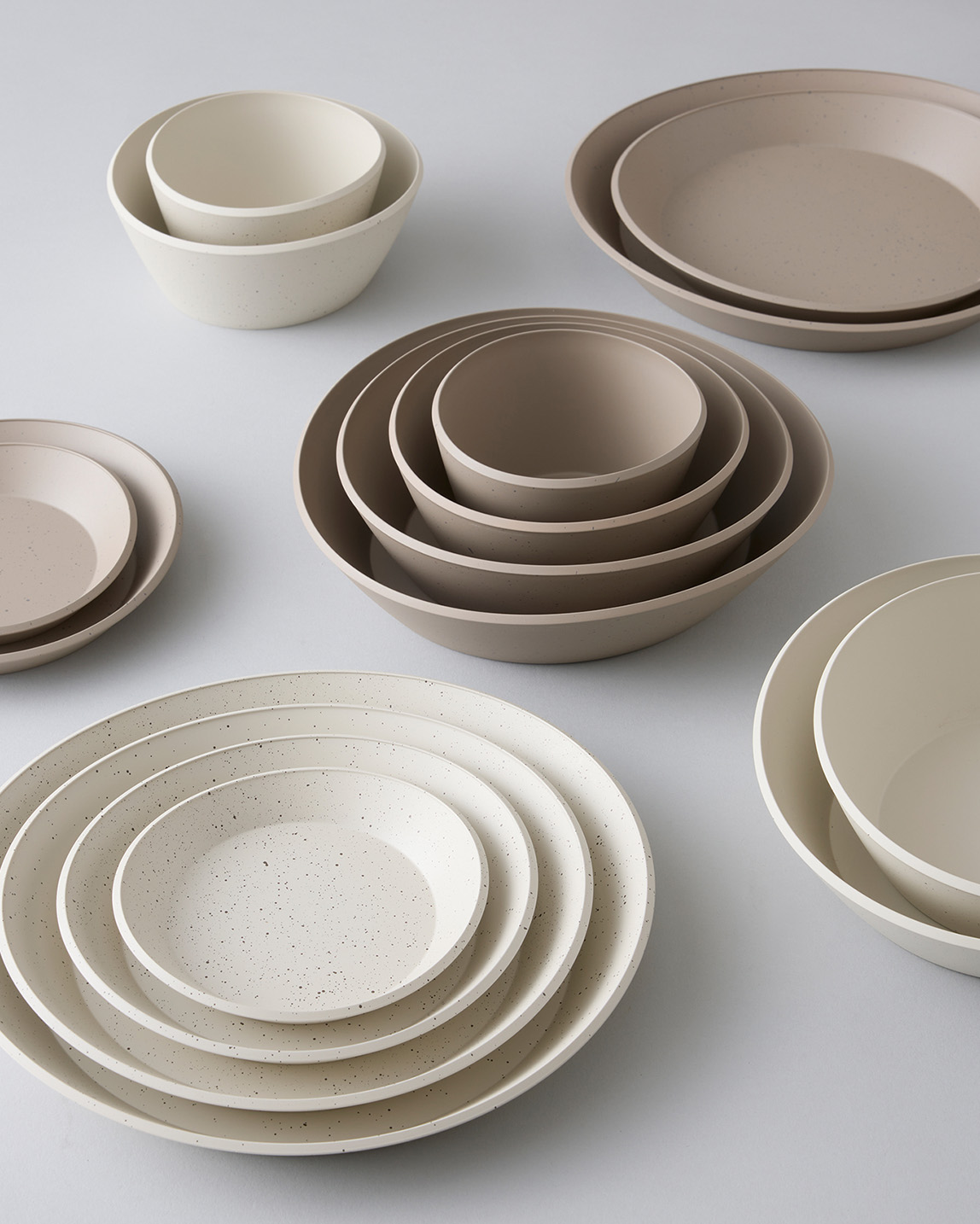 肌触りの良いマットな塗装に石目模様を施したテーブルウェア。水の波紋のようにコンパクトに重なります。一人暮らしからファミリーまでどんな場面でも多用途で使えるアイテムです。